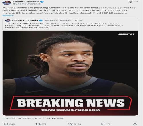 北京时间1月10日凌晨,NBA名记Shams报道,灰熊准备在交易截止日(2月6日)前送走莫兰特,首次开始聆听莫兰特的报价。灰熊决定围绕小贾伦-杰克逊打造阵容,多支球队正在追求莫兰特,灰熊的要价是潜力新星和首轮签。