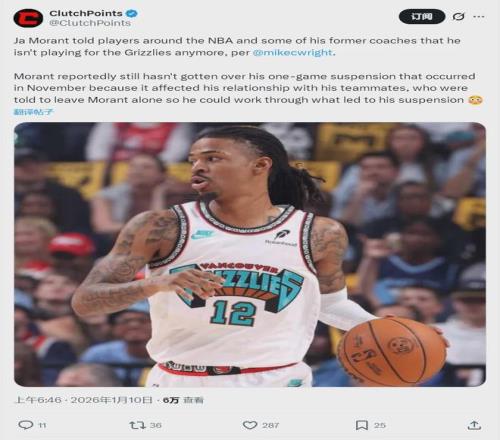 2025年休赛期,灰熊5年2.4亿美元续约小贾伦-杰克逊。莫兰特也有提前续约资格,最多能签2年1.284亿美元。当时莫兰特一边恭喜3J拿到大合同,一边表态希望自己也能续约。但是,灰熊并没有给莫兰特提供续约合同。